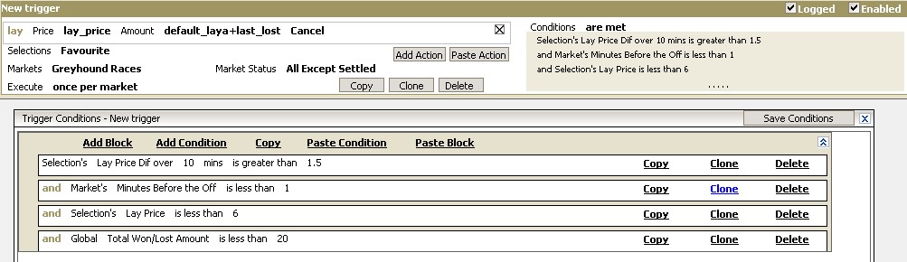 A trigger is a script or a set of logic-based instructions that tells the software exactly when and how to place, cancel, or green up a bet (lock in profit) across a market.